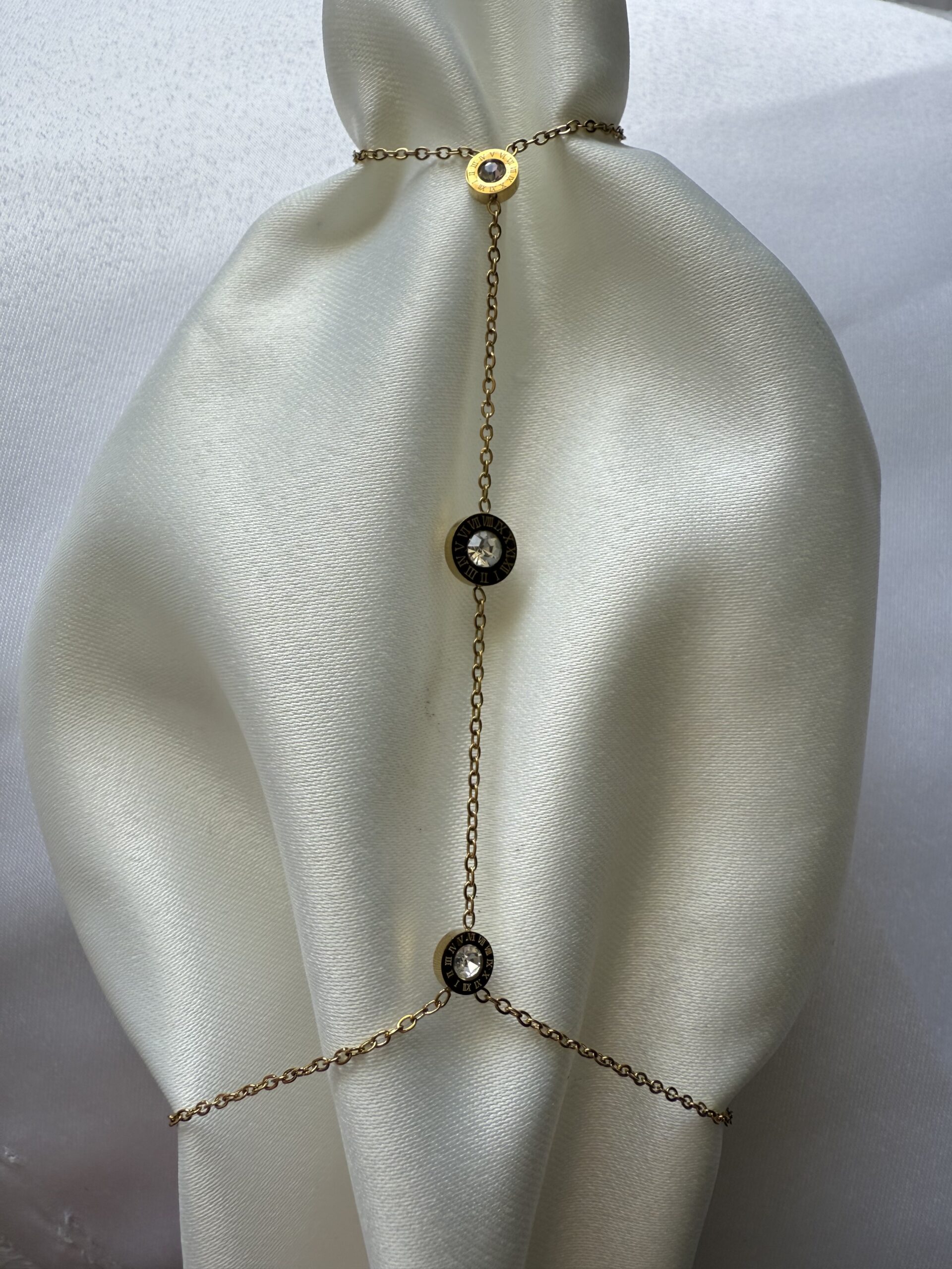 Roma rakamlarıyla süslenmiş siyah detaylar ve parlak taşlarla dikkat çeken bu altın rengi çelik bileklik, ince zincir yapısıyla zarif ve modern bir görünüm sunar. Günlük kullanımdan özel günlere kadar her stile uyum sağlayan bu bileklik, dayanıklı çelik malzemesi sayesinde uzun ömürlüdür ve stilinize şıklık katar.