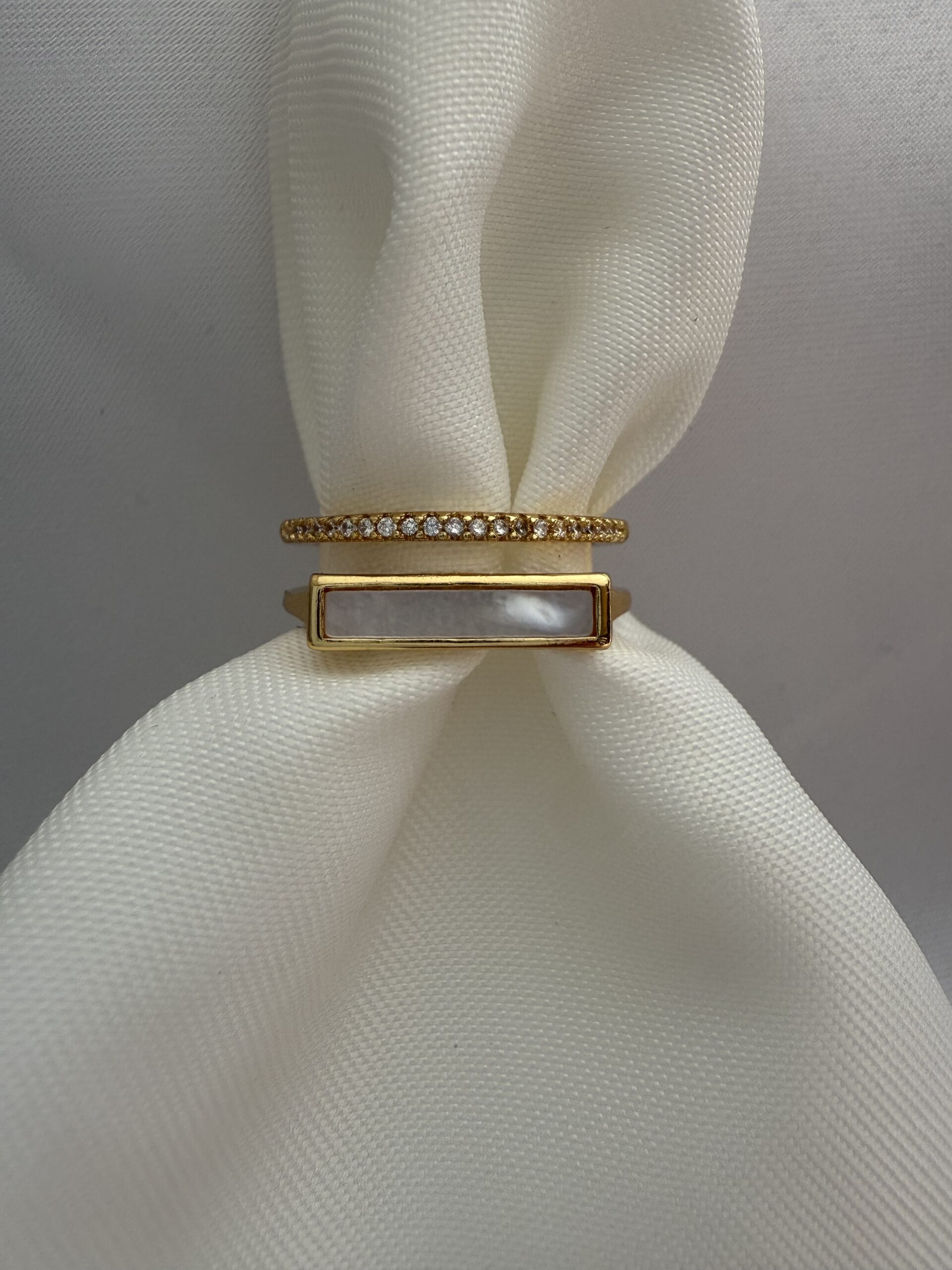 Modern çizgileriyle öne çıkan bu altın renk çift bant yüzük, zarif taşlı üst halkası ve inci görünümündeki dikdörtgen detayıyla dikkat çeker. Şık ve sofistike tasarımı sayesinde hem gündelik kullanımda hem de özel davetlerde stilinizi tamamlar. İki bantlı yapısıyla parmakta şık bir duruş sergiler.